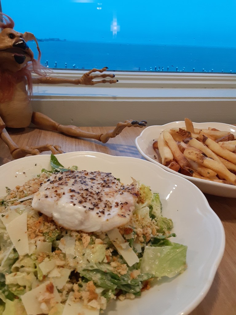 In between spying for dolphins in the sound, we perused the menu and decided upon a Caesar salad with fish of the day (rockfish) as well as a side of French fries. The salad was well dressed (midnight blue chiffon) and seasoned and the fries were pleasantly crispy though a bit heavy on the salt, especially on the bottom layer. However, this came in useful as we found the rockfish to be somewhat bland and underwhelming (even though it was a bit heavy on the pepper) and used the extra salt to enhance the flavor. The side of fries was a very generous portion for the price ($5) however we felt that the salad with fish was a rather steep ($22). But, as with most waterfront eateries, the view does add value though perhaps not enough to have us rushing for a return visit in the future.