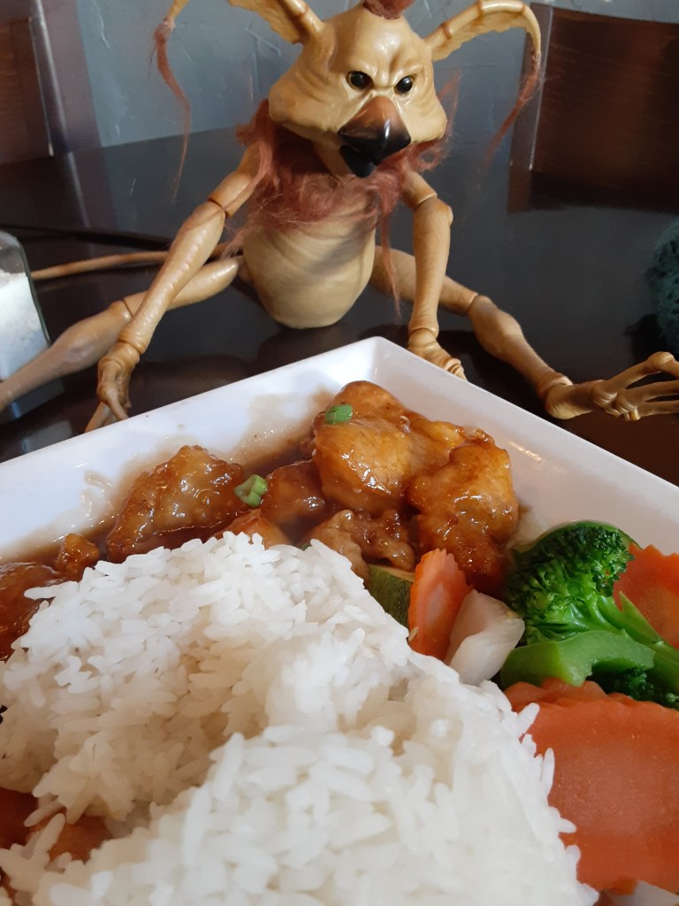 After some debate and backtracking, we eventually landed in the beyond for lunch- Beyond Restaurant Pho and Sushi. A relatively plain interior with some peppy music playing, the restaurant was conveniently uncrowded for a Saturday afternoon. We decided upon the Crispy Orange Chicken served with steamed vegetables and rice. I had considered a side of spring rolls as well but decided against it which was wise as the entree portion was quite large and was plenty for 2 meals that day. The food arrived quickly with the large ball of rice cracking open like an ice spider egg upon delivery (no knobby white spiders inside though I wouldn’t have turned them down).